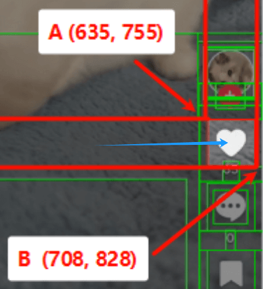 那么,【點(diǎn)擊坐標(biāo)】中的 X、Y 坐標(biāo)應(yīng)該怎么填寫呢?我們希望 RPA 點(diǎn)擊時(shí),能精準(zhǔn)點(diǎn)擊圖片的中心點(diǎn)位置(藍(lán)色箭頭所示)。然而,bounds 屬性提供的是兩個(gè)邊界坐標(biāo)(A 點(diǎn)和 B 點(diǎn))。如果填寫 A 或 B 點(diǎn)的坐標(biāo),可能會導(dǎo)致誤觸其他元素。