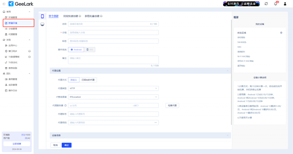 注冊后,在GeeLark內創(chuàng)建一個云手機環(huán)境。使用代理為該環(huán)境分配一個獨特的IP地址,進一步降低被檢測的風險。