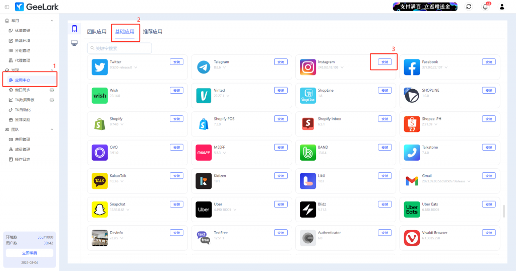 要將Instagram應用程序安裝在云手機環(huán)境中,你可以前往應用中心,在基礎應用菜單下找到Instagram,然后點擊安裝按鈕以便安裝。