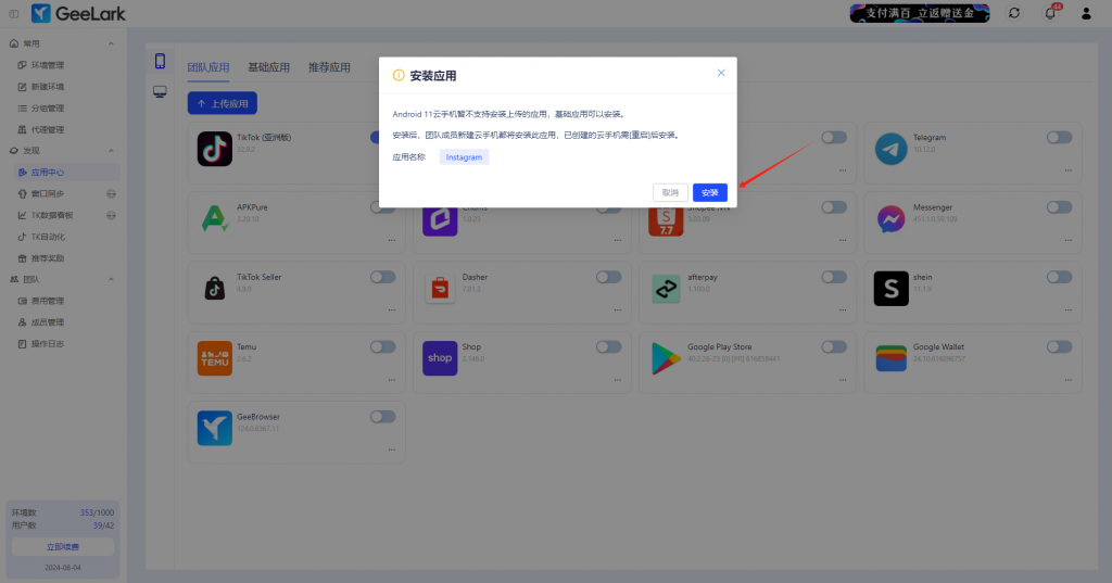 然后轉到團隊應用部分,并啟用Instagram的自動安裝。此后,應用將自動安裝在所有新的云手機環(huán)境上。