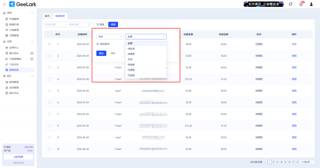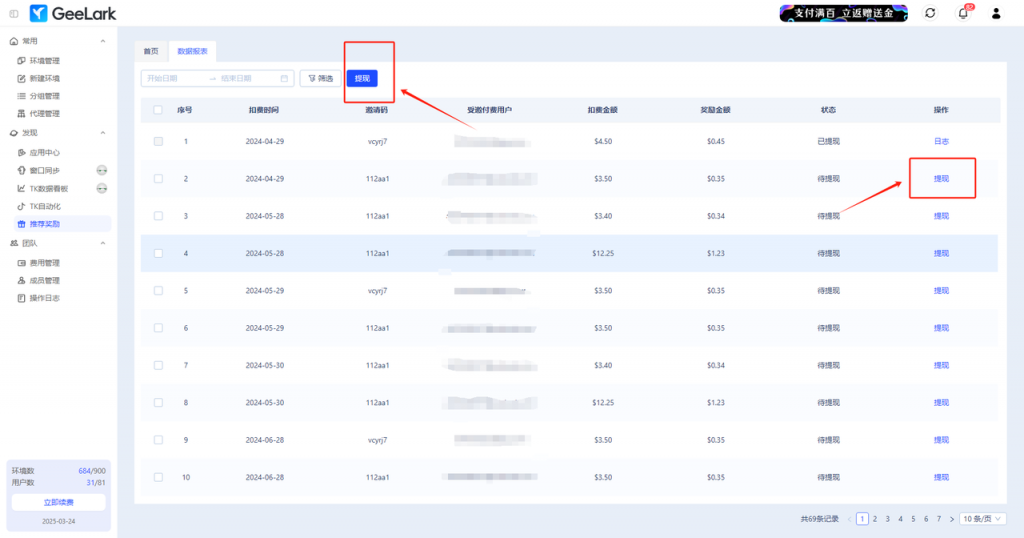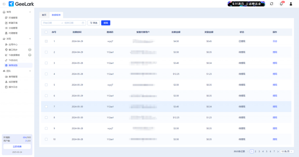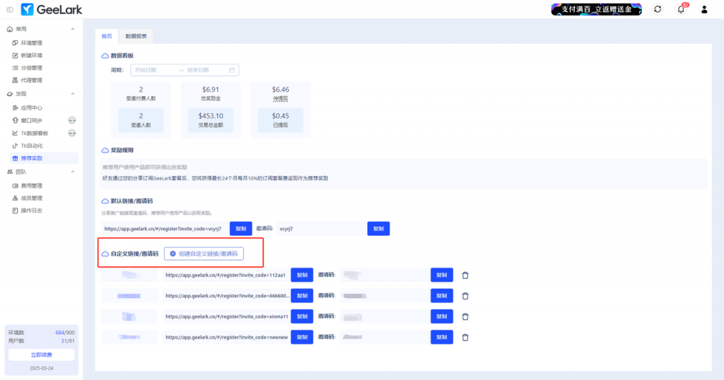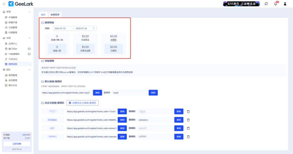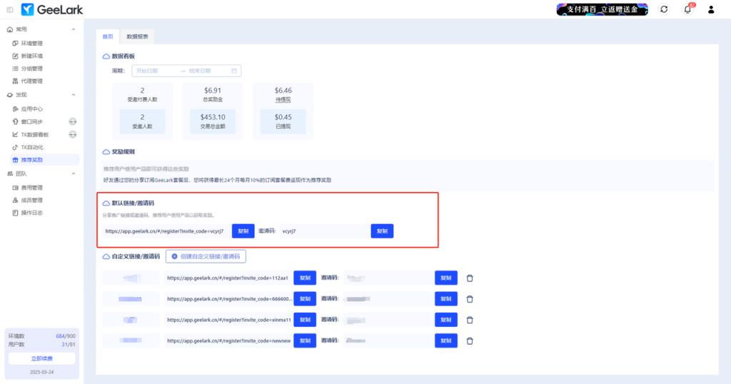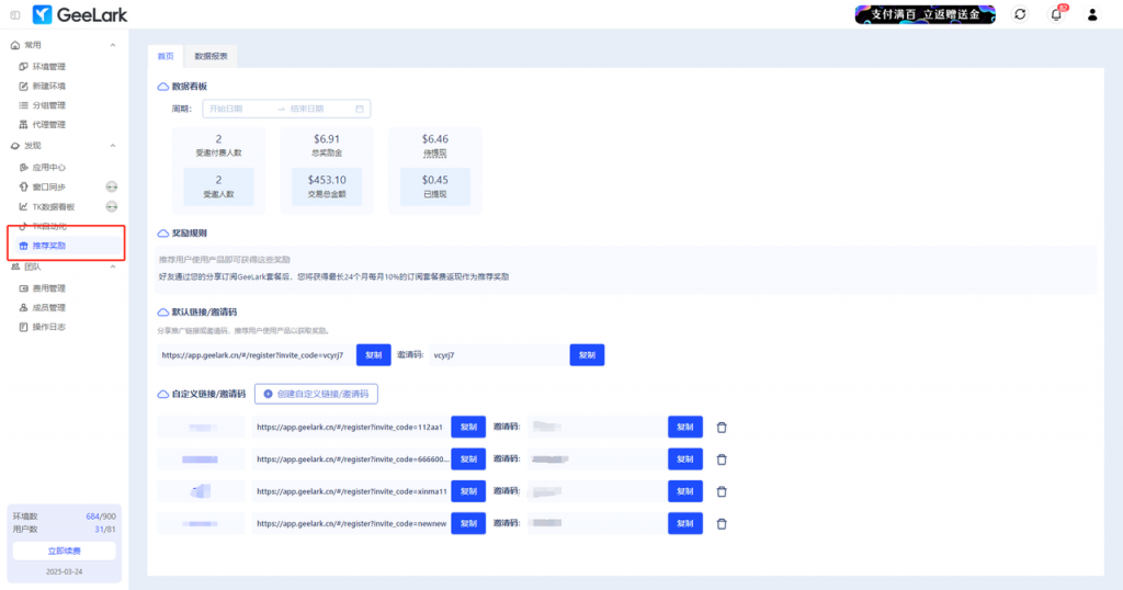 自推薦獎(jiǎng)勵(lì)功能上線以來(lái),便受到了大家的熱烈歡迎和關(guān)注。今天,我將向大家詳細(xì)介紹如何通過(guò)分享推廣鏈接或邀請(qǐng)碼,邀請(qǐng)你的朋友加入GeeLark,從而輕松賺取并提現(xiàn)豐厚的推薦獎(jiǎng)勵(lì)。
