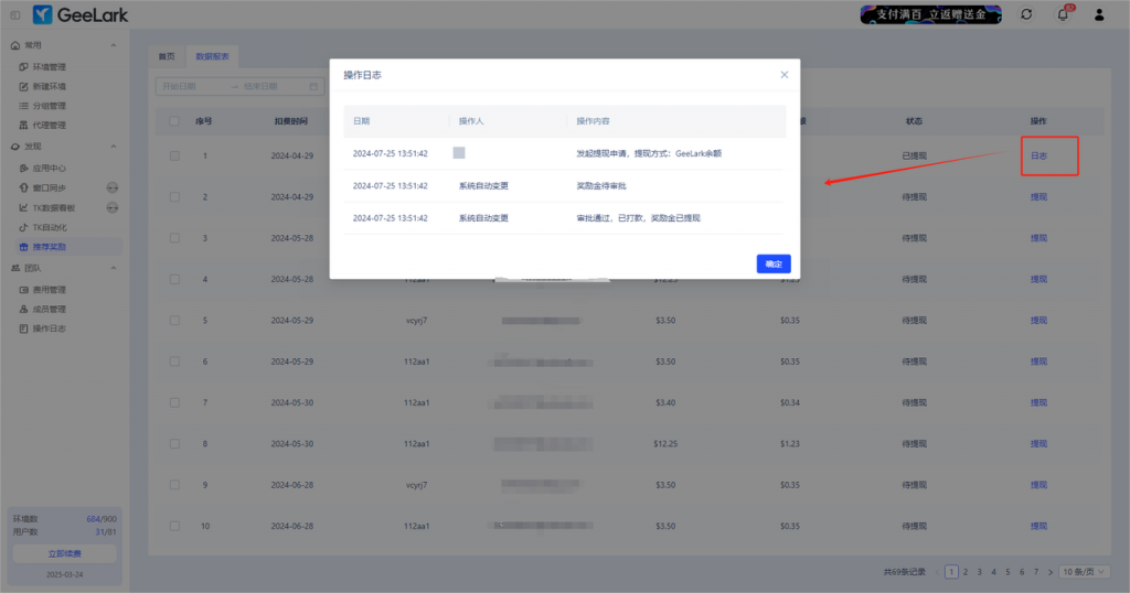 提現(xiàn)申請(qǐng)?zhí)峤缓?,在?shù)據(jù)報(bào)表的操作中會(huì)顯示日志,通過(guò)日志,你可清晰的看到提現(xiàn)的進(jìn)度和結(jié)果。