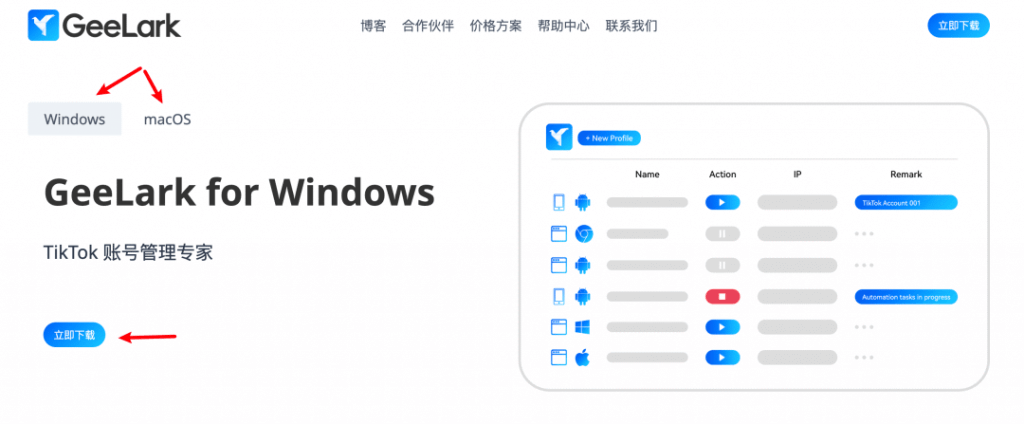 訪問(wèn) GeeLark下載中心 選擇對(duì)應(yīng)的Windows或macOS版本,下載GeeLark;