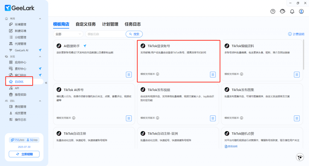 1.準(zhǔn)備完畢后,現(xiàn)在可以進(jìn)入 GeeLark 自動化欄目,選擇“ TikTok 登錄賬號”進(jìn)行批量操作啦。