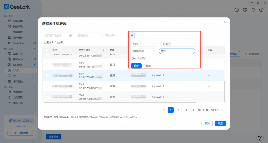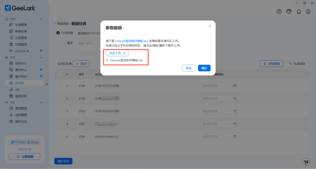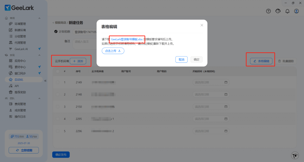 2. 進(jìn)入功能后,首先選擇你想要登錄賬號的云手機(jī)環(huán)境,你可以根據(jù)環(huán)境信息進(jìn)行篩選,更高效協(xié)助你選擇云手機(jī)環(huán)境進(jìn)行任務(wù)。選擇完成后點(diǎn)擊表格編輯,點(diǎn)擊模板進(jìn)行下載表格。表格內(nèi)部會自動同步好你所選環(huán)境。