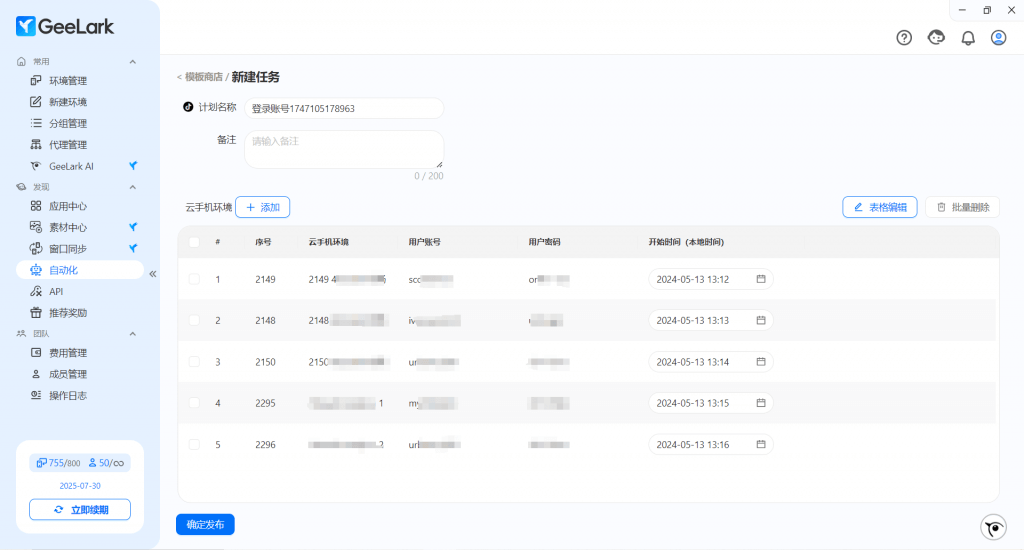 5. 上傳完畢后,你可以看到 GeeLark 已同步你所填信息,點(diǎn)擊“確定發(fā)布”,即可開始批量登錄賬號任務(wù)。