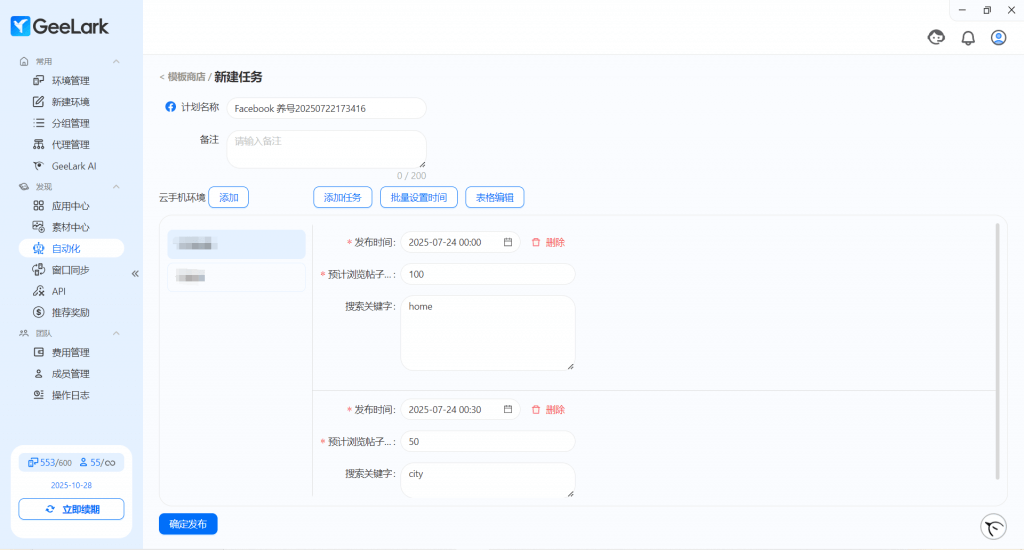 1. 創(chuàng)建定時(shí)任務(wù)為例,進(jìn)入模板后點(diǎn)擊“添加”按鈕,選擇要養(yǎng)號的云手機(jī)環(huán)境;?2.?點(diǎn)擊“添加任務(wù)”按鈕,可以具體設(shè)定多云手機(jī)環(huán)境、多項(xiàng)任務(wù)。并填入發(fā)布任務(wù)的時(shí)間和瀏覽帖子數(shù)量,你可以添加搜索關(guān)鍵字,讓自動(dòng)化瀏覽更加專業(yè)符合你的運(yùn)營方向,培養(yǎng)賬號標(biāo)簽。