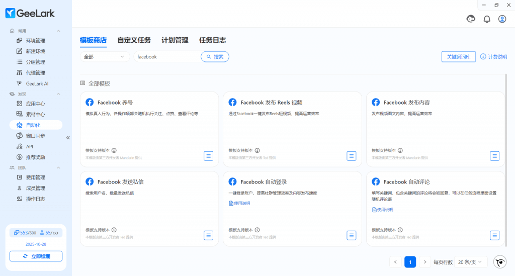 GeeLark 產(chǎn)品擁有「Facebook 養(yǎng)號」模板,幫助你的賬號表現(xiàn)得更像真人,加快養(yǎng)號進(jìn)度。它會讓賬號瀏覽內(nèi)容、點(diǎn)贊、關(guān)注,從而自然增長。1. 下載并登錄 GeeLark;2. 點(diǎn)擊左側(cè)“自動(dòng)化”一欄,找到或搜索 「Facebook 養(yǎng)號」模板并點(diǎn)擊運(yùn)行。 你可以創(chuàng)建定時(shí)任務(wù)/循環(huán)任務(wù)/或根據(jù)自身需求自定義相關(guān)流程。