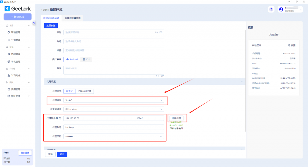 購(gòu)買(mǎi)好代理IP后,打開(kāi)Geelark,點(diǎn)擊 【新建環(huán)境】 – 【新建云手機(jī)環(huán)境】,按步驟配置到Geelark云手機(jī)上,填寫(xiě)環(huán)境名稱、分組、標(biāo)簽等信息。