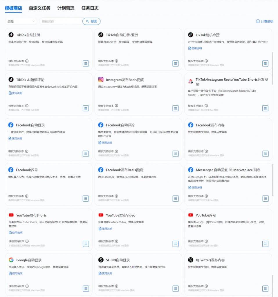 GeeLark自動(dòng)化不僅有支持TikTok的相關(guān)模板,包括但不限于上述講述的功能和TikTok批量登錄注冊(cè)等等,還對(duì)于運(yùn)營海外各大社媒平臺(tái)均有自動(dòng)化腳本支持,如X(Twitter)、Meta(Facebook)、Instagram、YouTube等。