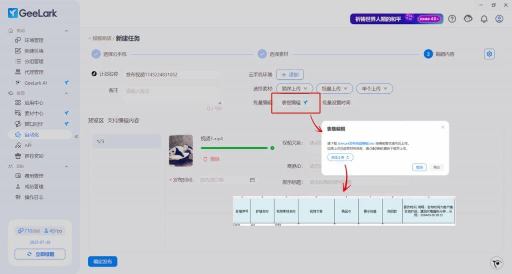 你也可以點(diǎn)擊【表格編輯】,在Excel表格中輸入以上內(nèi)容,并【點(diǎn)擊上傳】,內(nèi)容會(huì)被自動(dòng)識(shí)別并批量自動(dòng)導(dǎo)入到云手機(jī)頁面。與素材編輯一樣,你也可以通過表格編輯一鍵設(shè)置視頻文案等信息。
