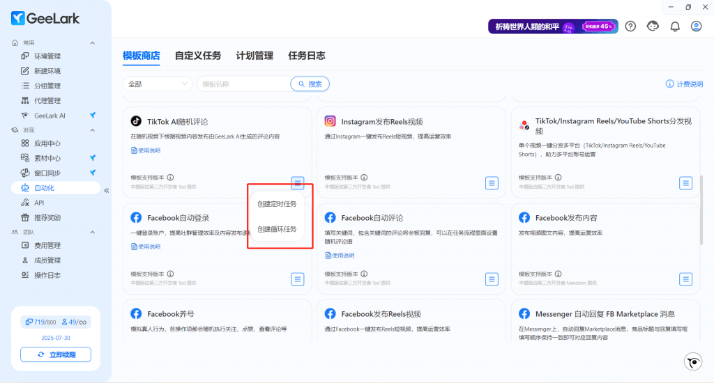 在模板商店里,我們提供由第三方開發(fā)者提供的 RPA 腳本,你可進(jìn)行更加專業(yè)的自動(dòng)化功能,也可以自定義設(shè)置合適自己運(yùn)營的相關(guān)任務(wù)。