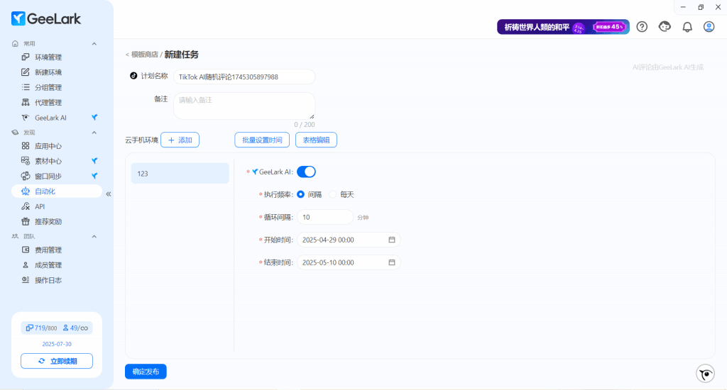 在部分自動(dòng)化功能中,用戶可以設(shè)置定時(shí)&循環(huán)任務(wù),一次設(shè)置即可每天或每個(gè)時(shí)段定時(shí)執(zhí)行任務(wù),通過自動(dòng)化技術(shù)顯著節(jié)省人力成本,維持賬號(hào)活躍度。