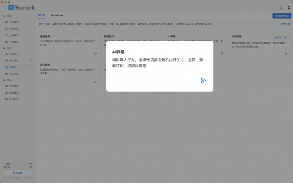在GeeLark最新版本中,在 AI 技術(shù)的加持下,懶人養(yǎng)號(hào)功能全新升級(jí)為 AI 養(yǎng)號(hào),在執(zhí)行自動(dòng)化任務(wù)時(shí),操作習(xí)慣將更加貼合真實(shí)用戶。你只需選擇養(yǎng)號(hào)環(huán)境并預(yù)設(shè)關(guān)鍵詞,云手機(jī)便會(huì)像真人一樣執(zhí)行瀏覽、搜索、點(diǎn)贊等一系列操作,輕松解放雙手,助你快速獲得一批成熟賬號(hào)。未來,我們將繼續(xù)利用更多 AI 技術(shù),為跨境賣家?guī)砀鼘?shí)用高效的功能。