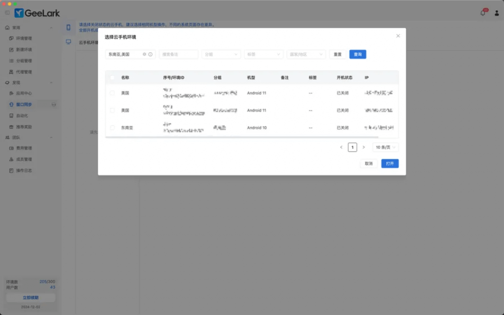 當(dāng)你使用窗口同步功時(shí),如果需要調(diào)整同步的云手機(jī)環(huán)境的數(shù)量,現(xiàn)在只需在添加云手機(jī)環(huán)境頁面中,調(diào)整已經(jīng)勾選的云手機(jī)環(huán)境,即可輕松批量開啟或關(guān)閉云手機(jī)環(huán)境。