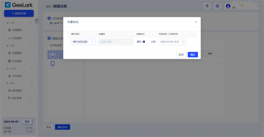 GeeLark云手機的「懶人養(yǎng)號」功能,能夠幫助您無需人工干預(yù),就可以完成標簽的精準打造。通過預(yù)設(shè)關(guān)鍵詞,云手機將自動執(zhí)行瀏覽、搜索、點贊等一系列行為,搭建起精準定位的標簽體系,讓內(nèi)容觸達度最大化。