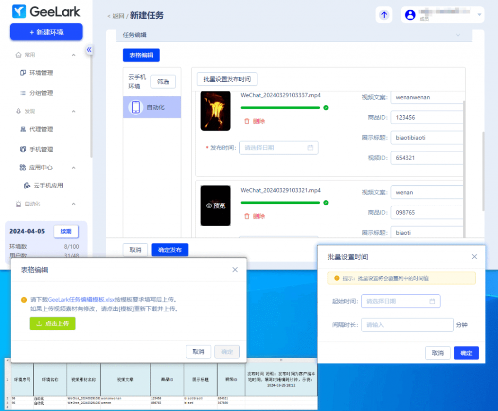 GeeLark云手機的「批量上傳視頻」和「批量上傳圖集」功能擺脫了單點作業(yè)的困擾。無論是視頻內(nèi)容還是圖文搭配,只需一鍵設(shè)定標題、發(fā)布時間等信息,云手機便能批量處理上傳工作,讓主副賬號的配合更加高效和精準。你還可以通過表格方式對每個視頻與發(fā)布賬號的組合進行進一步的個性化設(shè)置,從而實現(xiàn)更加精細和高效的運營管理。接下來只需要交給GeeLark,就可以輕松應(yīng)對內(nèi)容分發(fā)的場景。