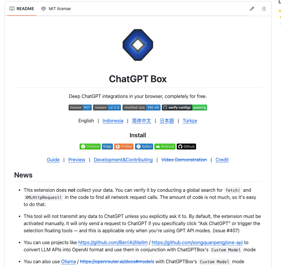 ChatGPT Box 是一款基于瀏覽器的免費開源插件,支持配置不同的 AI 大模型以協(xié)助內(nèi)容生成和翻譯。除了在線大模型,ChatGPT Box 還提供 Ollama 的配置接口,方便用戶調(diào)用本地大模型。通過 ChatGPT Box,用戶不僅可以實現(xiàn)頁面內(nèi)容的一鍵總結(jié),還能在當前網(wǎng)頁上調(diào)出對話窗口,輕松調(diào)用大模型,讓 AI 成為你得心應(yīng)手的工具。