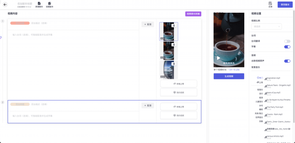 你還可以使用智能混剪功能,根據(jù)預(yù)設(shè)的視頻腳本和故事大綱,在每個單獨的腳本中插入多個視頻片段,形成多樣的混剪組合。在此過程中,AI 智能會自動匹配字幕、聲音和音樂,實現(xiàn)批量視頻內(nèi)容的高效生產(chǎn)。