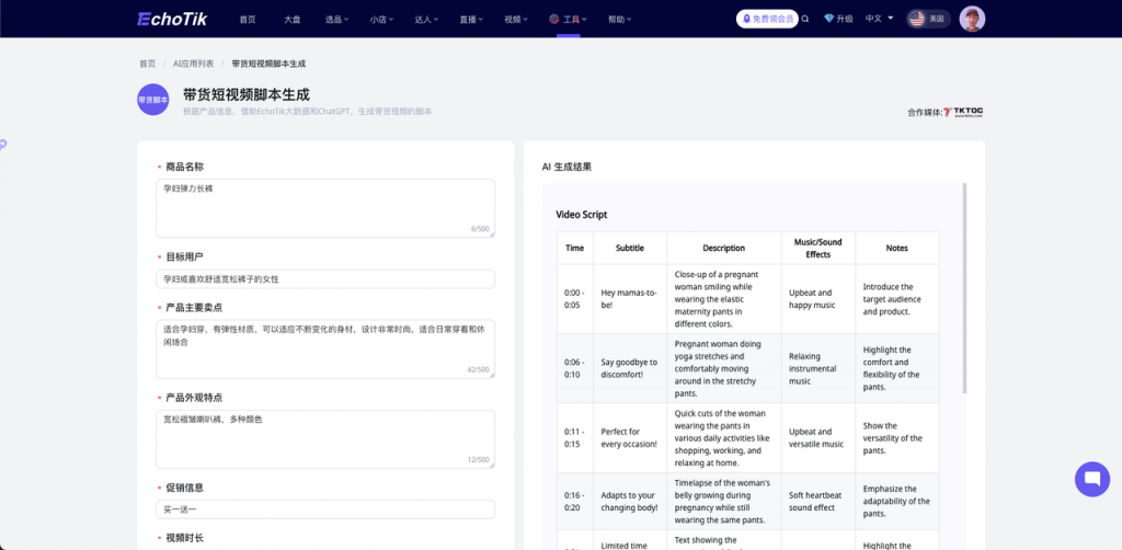 EchoTik 是一款知名的 TikTok 分析工具,賣家不僅可以快速了解 TikTok 上熱賣的產(chǎn)品,還能利用 EchoTik 的AI 工具箱功能,高效完成內(nèi)容生產(chǎn)的各個環(huán)節(jié)。例如,在生成帶貨短視頻腳本時,只需提供產(chǎn)品信息和賣點,AI 工具便能迅速為你生成帶貨視頻腳本,幫助你在與達人溝通時更好地制作視頻。