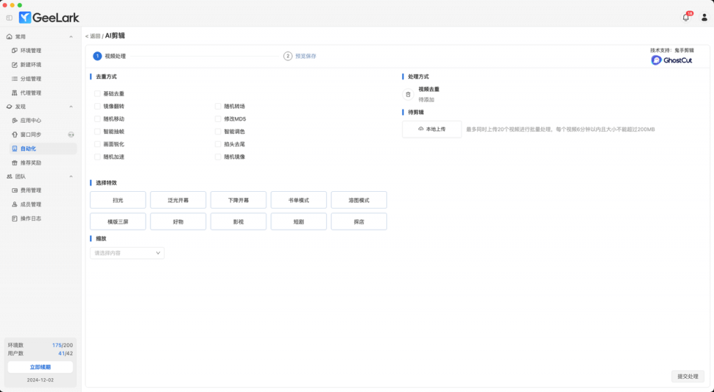 此外,GeeLark 還支持視頻AI 剪輯功能。當你準備好將推廣視頻分發(fā)到多個不同賬號時,AI 剪輯功能能夠智能地為視頻添加隨機效果,同時保持視頻核心內(nèi)容的完整性,確保內(nèi)容不會因重復(fù)分發(fā)而影響效果。