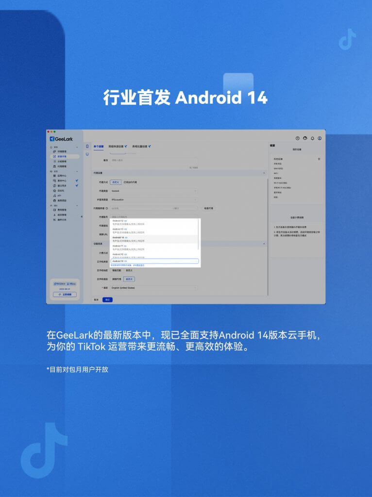 ??GeeLark現(xiàn)已全面支持Android 14版本云手機,為你的TikTok運營帶來更流暢、更高效的體驗。