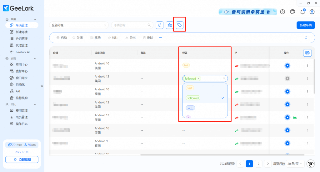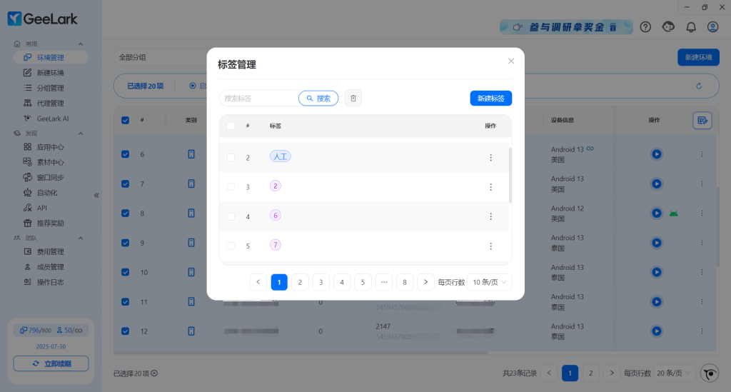 在 GeeLark 最新版本中,“環(huán)境管理”支持一鍵批量新機以及新增環(huán)境標簽管理。你可以通過選擇想要重新建立的云手機環(huán)境,點擊“重置”后幫助你一鍵新機,減少重復操作,在創(chuàng)建新云手機環(huán)境上提高效率。