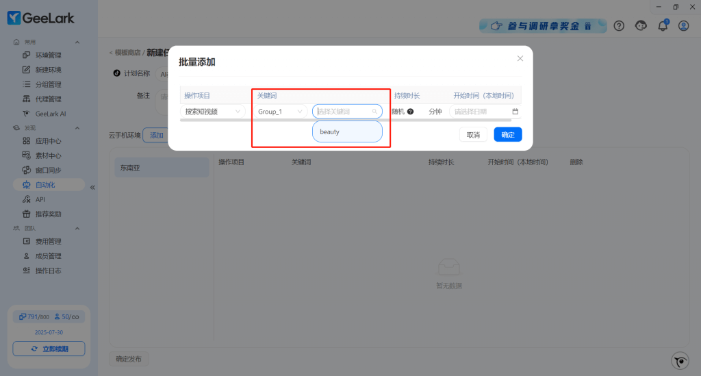 在 GeeLark 最新版本中,設置 AI 養(yǎng)號自動化任務時,你可以快速便捷選擇對應領域的關鍵詞,減少每次重復輸入的繁瑣過程。分組后詞庫結構更直觀,同時方便適應運營不同場景快速切換詞庫組,記錄你的高頻內容詞匯使用,優(yōu)化運營策略。
