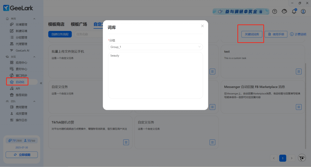 在“自動化”欄目選擇自定義任務,在右上角可以選擇“關鍵詞詞庫”進行設置,你可以按照不同的領域或專業(yè)內容設定相關分組,在每個分組內輸入相關關鍵詞,這樣就已完成你的專屬跨境詞庫設置。