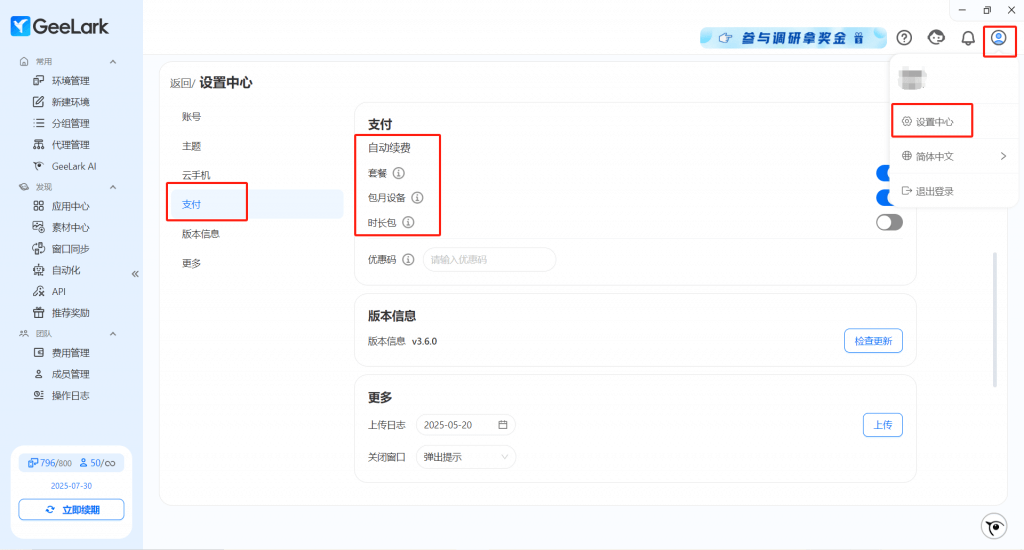 在 GeeLark 最新版本中,你可以點擊右上角個人信息 -“設置中心”中找到“支付”設置,可以選擇是否打開相關自動續(xù)費,套餐、包月設備、時長包均支持自動續(xù)費。