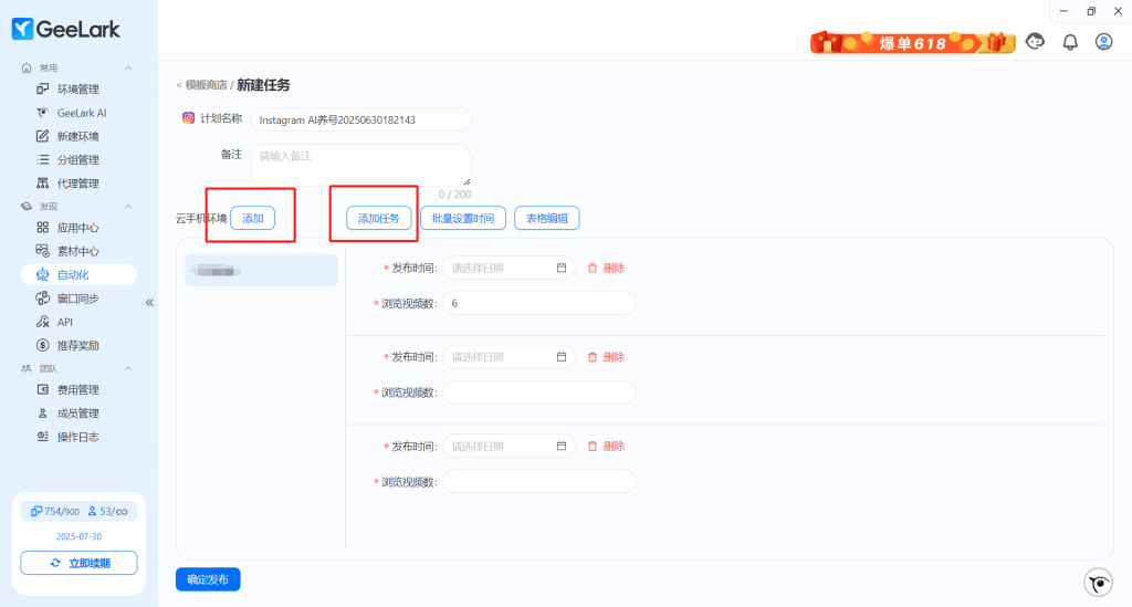 3. 確認(rèn)設(shè)置無誤后,可點擊左下角“確認(rèn)發(fā)布”,后臺開始運行養(yǎng)號任務(wù)。?你可以在任務(wù)日志/計劃管理中查看運行狀態(tài),便于你及時做出運營調(diào)整。