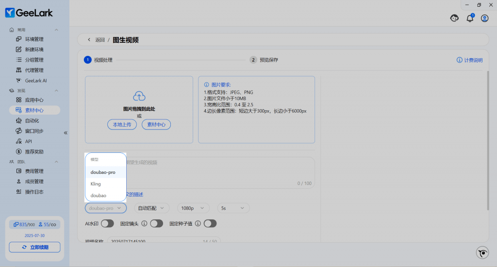 ??在最新版本中,GeeLark AIGC(圖生視頻)現已接入 Seedance 1.0 pro 和 KLING 1.6大模型。你可以在視頻生成的基礎設置中選擇合適的 AI 大模型,結合其強大的多模態(tài)生成能力和云計算基礎設施,為跨境個人賣家或團隊運營者提供高效、靈活的視覺內容生產解決方案。