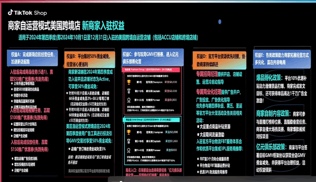 相信大家都能看到今年官方對(duì)于美區(qū)入駐門檻一降再降,對(duì)于第四季度新入駐的自運(yùn)營(yíng)商家(包括 ACCU 店鋪和跨境店鋪),官方提供了非常大的激勵(lì)政策,可見(jiàn) TikTok Shop 越早進(jìn)場(chǎng)機(jī)會(huì)越大