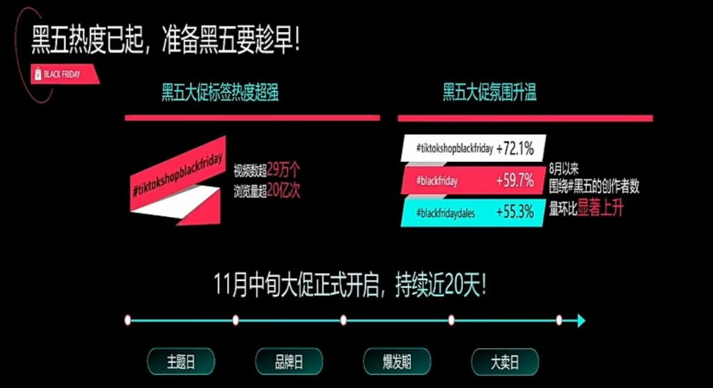 黑五已經(jīng)正式拉開(kāi)帷幕,相信很多賣家的準(zhǔn)備工作都已經(jīng)進(jìn)入了白熱化階段,TikTok已提前開(kāi)始了大促。而隨著特朗普勝選,即將擔(dān)任美國(guó)新一屆總統(tǒng),這為 TikTok 在美國(guó)的發(fā)展帶來(lái)了新的機(jī)遇。在這個(gè)關(guān)鍵時(shí)刻,我們將整理出跨境大賣家的實(shí)戰(zhàn)經(jīng)驗(yàn),幫助你更好地把握年底的促銷機(jī)會(huì)。