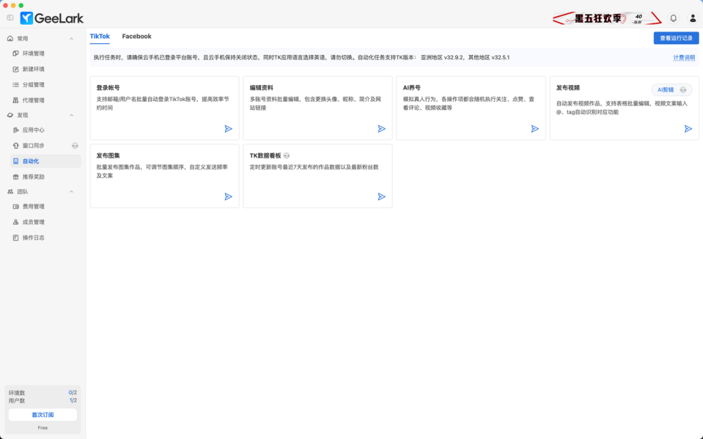 在分發(fā)方面,由于 TikTok 存在天選號(hào)的概率,有的賬號(hào)一發(fā)布就會(huì)有不錯(cuò)的流量,但是有的號(hào)無(wú)論如何發(fā)視頻流量都很少,因此在完成素材的混剪或者翻拍后,可以考慮采取多個(gè)賬號(hào)分發(fā)測(cè)試,你可以借助 GeeLark 的自動(dòng)化功能,實(shí)現(xiàn) AI 養(yǎng)號(hào),自動(dòng)發(fā)布視頻等一系列操作,提高測(cè)試效率,幫助你輕松篩選出優(yōu)質(zhì)賬號(hào)的同時(shí)完成素材的測(cè)試。