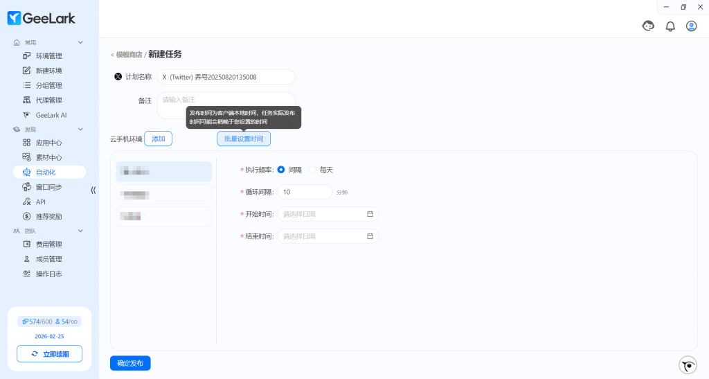3. 確認(rèn)設(shè)置無誤后,可點(diǎn)擊左下角“確認(rèn)發(fā)布”,后臺(tái)開始運(yùn)行養(yǎng)號(hào)任務(wù)。 你可以在任務(wù)日志/計(jì)劃管理中查看運(yùn)行狀態(tài),便于你及時(shí)做出運(yùn)營(yíng)調(diào)整。