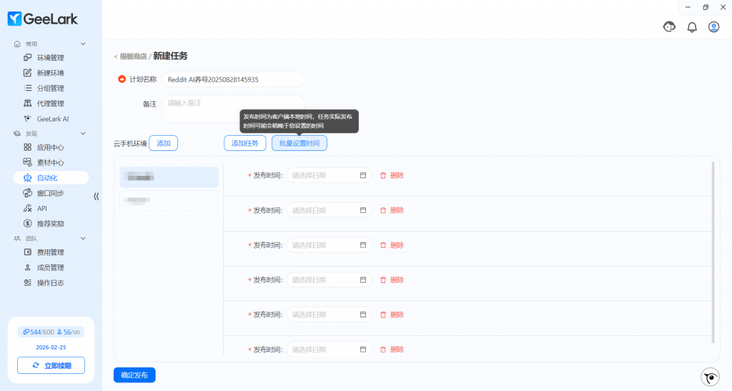 3. 點擊“添加任務(wù)”按鈕,可以具體設(shè)定多云手機(jī)環(huán)境、多項任務(wù),還可以批量設(shè)置運行時間; 你可以喚醒右下角的 GeeLark AI,幫助你編寫視頻標(biāo)題,用一個簡潔有網(wǎng)感的標(biāo)題突出你的內(nèi)容價值和提高用戶點擊率。