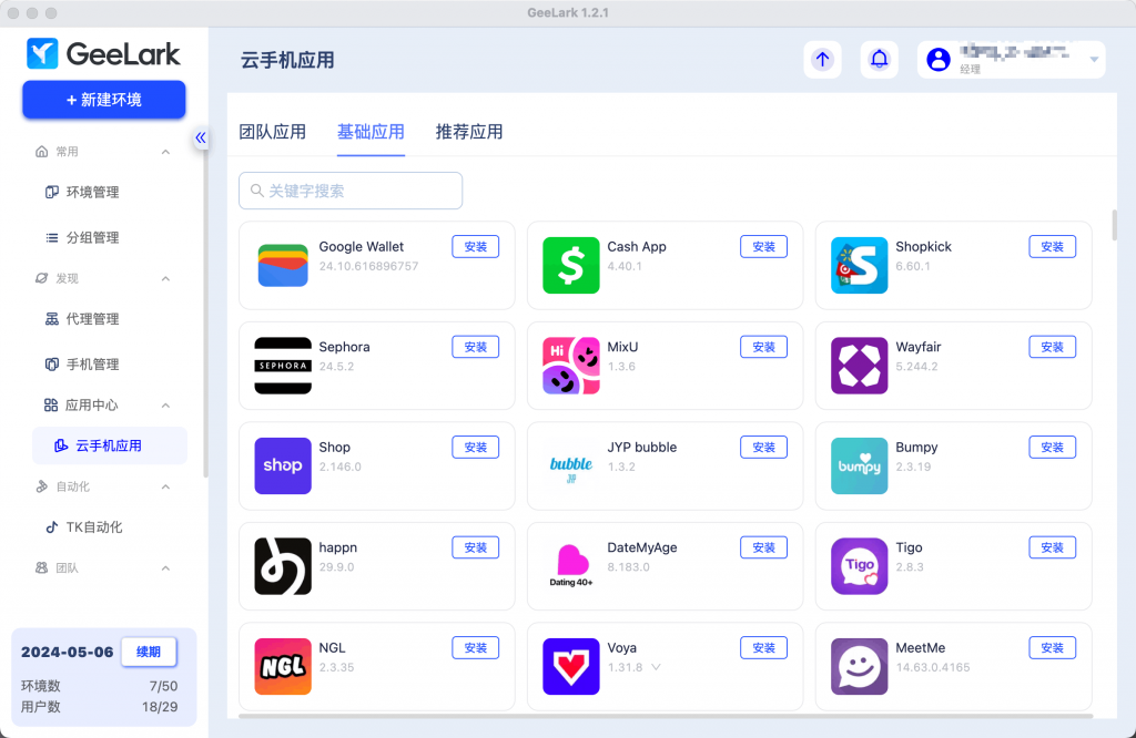 你現(xiàn)在可以在 GeeLark 的【云手機應用】菜單中,一鍵批量安裝指定應用到云手機環(huán)境中,從而大幅提升賬號環(huán)境管理的效率