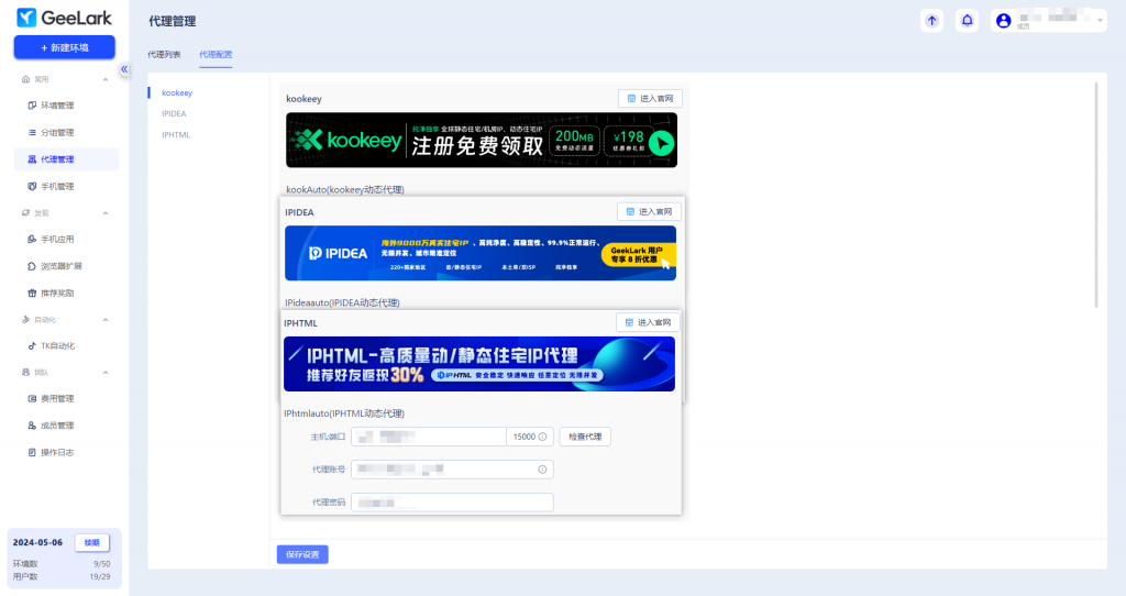 代理配置新增了快捷動態(tài)代理配置功能,并且我們已經(jīng)接入了三家網(wǎng)絡服務提供商:kookeey、IPIDEA和IPHTML,未來我們還會接入更多的網(wǎng)絡服務提供商,以滿足不同的網(wǎng)絡服務需求。當你在上述網(wǎng)絡服務提供商處購買了動態(tài)代理服務后,在GeeLark「代理配置」頁面中直接填寫網(wǎng)絡服務提供商提供的代理信息。當你在新建代理環(huán)境時,可以直接選擇相應的動態(tài)代理,不用再重復輸入。