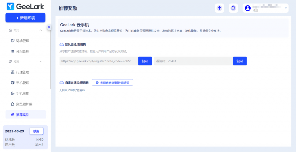此次更新增加了「推薦獎勵」模塊。你可以通過分享推廣鏈接或邀請碼,邀請朋友使用GeeLark云手機。邀請碼分為兩種: