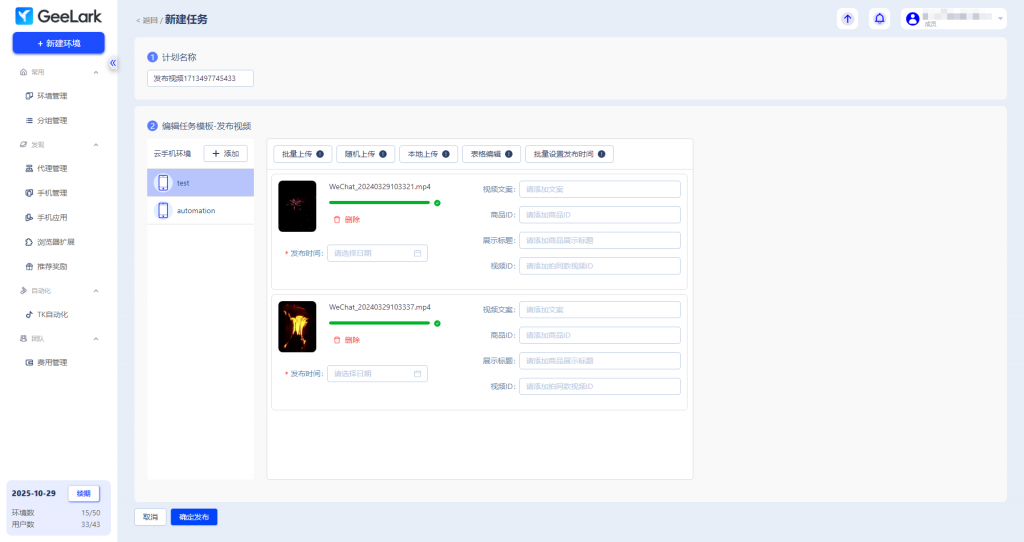 - 批量上傳:針對已添加的所有云手機環(huán)境均批量上傳單個或多個視頻;