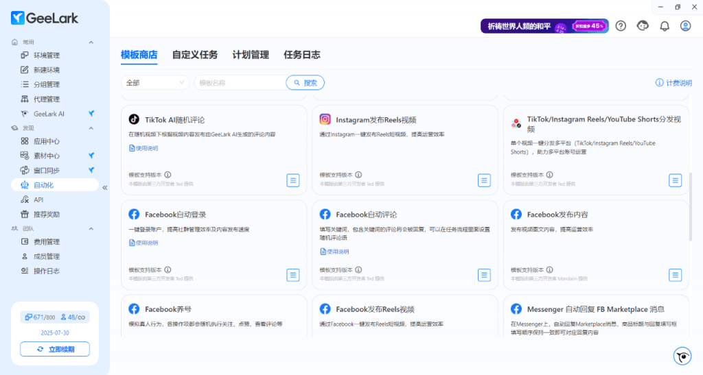 A:目前模板商城提供了TikTok、YouTube、Facebook等平臺的自動化功能模板,如果有其它平臺的自動化功能需求,可以通過 RPA 功能自行搭建自動化工作流程。
