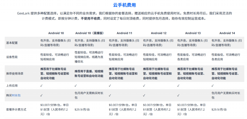 - 按分鐘計費的云手機,先使用免費時長,其次扣時長包,最后按每分鐘$0.007計費,不足1分鐘按1分鐘計費