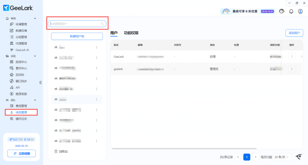 A:1. 點擊“成員管理”,輸入賬號名即可全局搜索用戶,查看設置的成員是否授權了對應的分組;