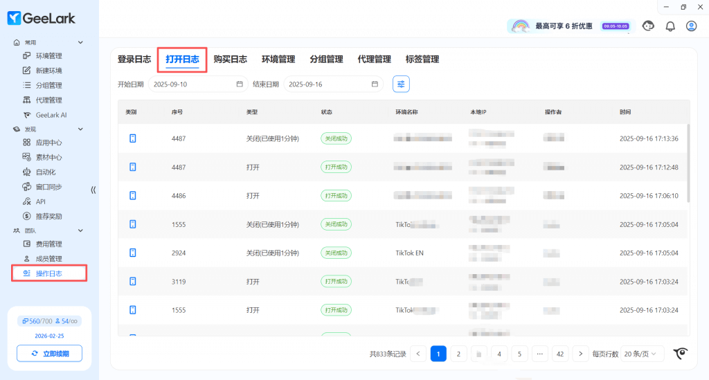A:有。你可以點擊左側“操作日志”——“打開日志”里查看,同時支持篩選成員、序號等,更加方便查找。