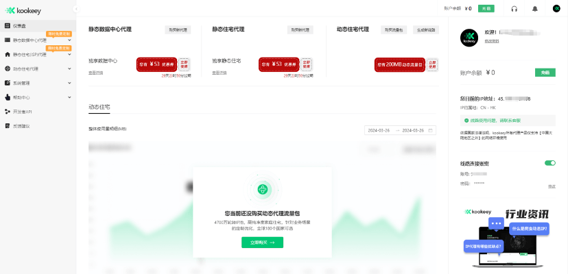 注冊并登錄 kookeey后臺,新用戶注冊即可免費領取200MB動態(tài)測試流量和¥198的優(yōu)惠券禮包。