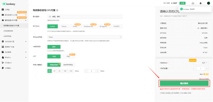 這里以靜態(tài)住宅為例,點擊:靜態(tài)住宅(ISP)代理--購買靜態(tài)住宅(ISP)代理,確認訂單信息無誤后點擊 確認購買。
