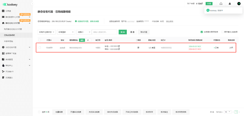 例如:在kookeey官網(wǎng)中生成的線路信息為socks5://134.195.15.76:16842:kookeey:test1234,其中[代理類型]選擇socks5,134.195.15.76填入[代理服務器],16842填入[端口],kookeey填入[代理賬號],test1234填入[代理密碼],然后點擊[檢查代理]