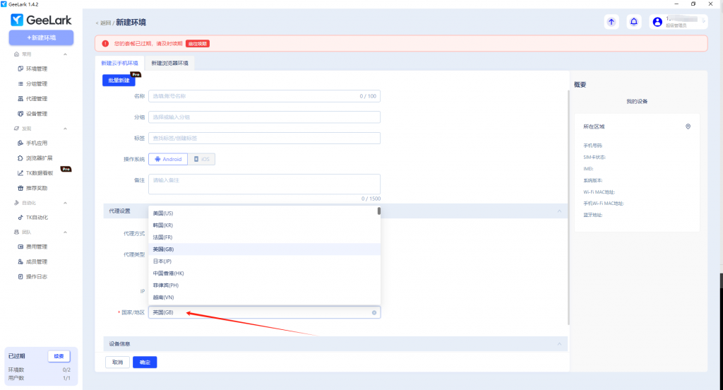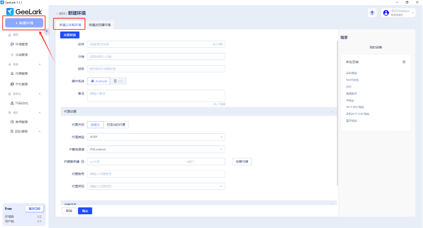 點擊 [新建環(huán)境] - [新建云手機環(huán)境],填寫環(huán)境名稱、分組、標簽等信息;