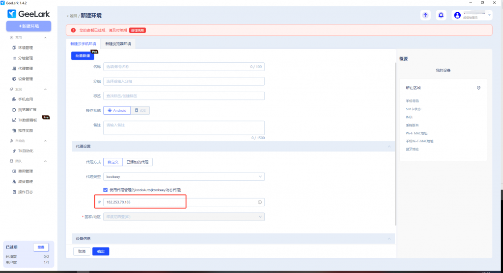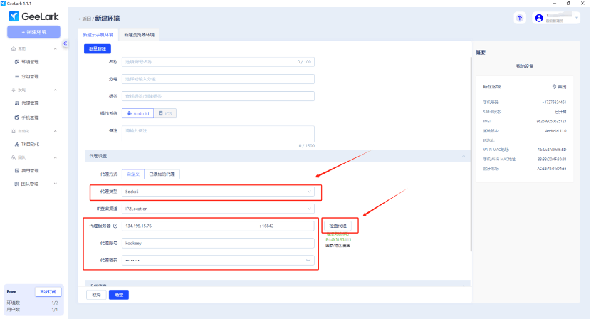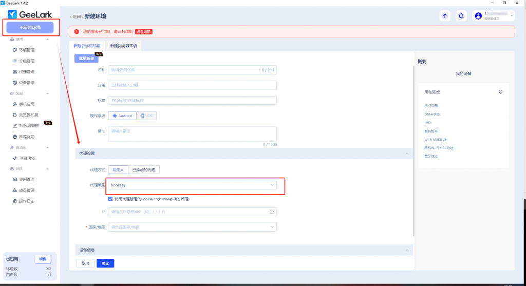 下面是介紹在GeeLark云手機中配置kookeey動態(tài)代理IP的流程。